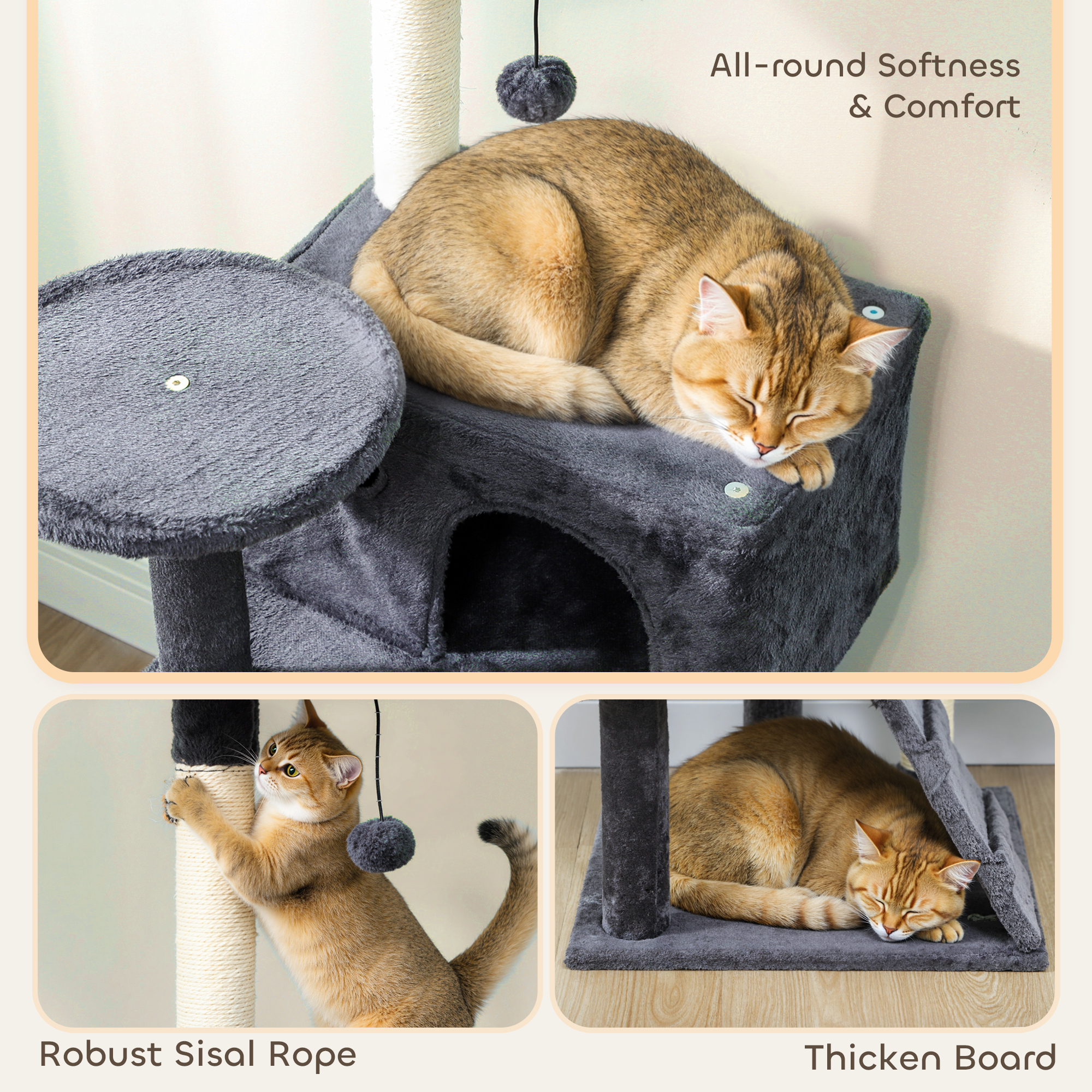 - Sisal-wrapped posts for digging and scratching, saving your furniture from damage